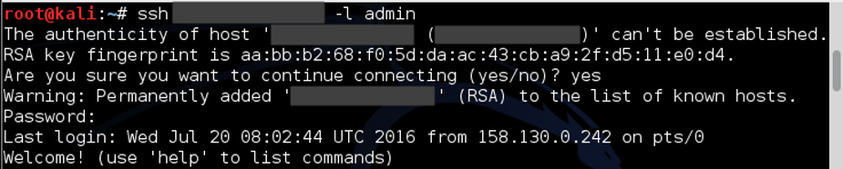 Innanzitutto, colleghiamoci al nostro server con una shell SSH. Userò Kali Linux, ma dal momento che questo hack è molto semplice può essere eseguito usando qualsiasi distribuzione, senza l'ausilio di strumenti di hacking particolari come ad es. Metasploit.